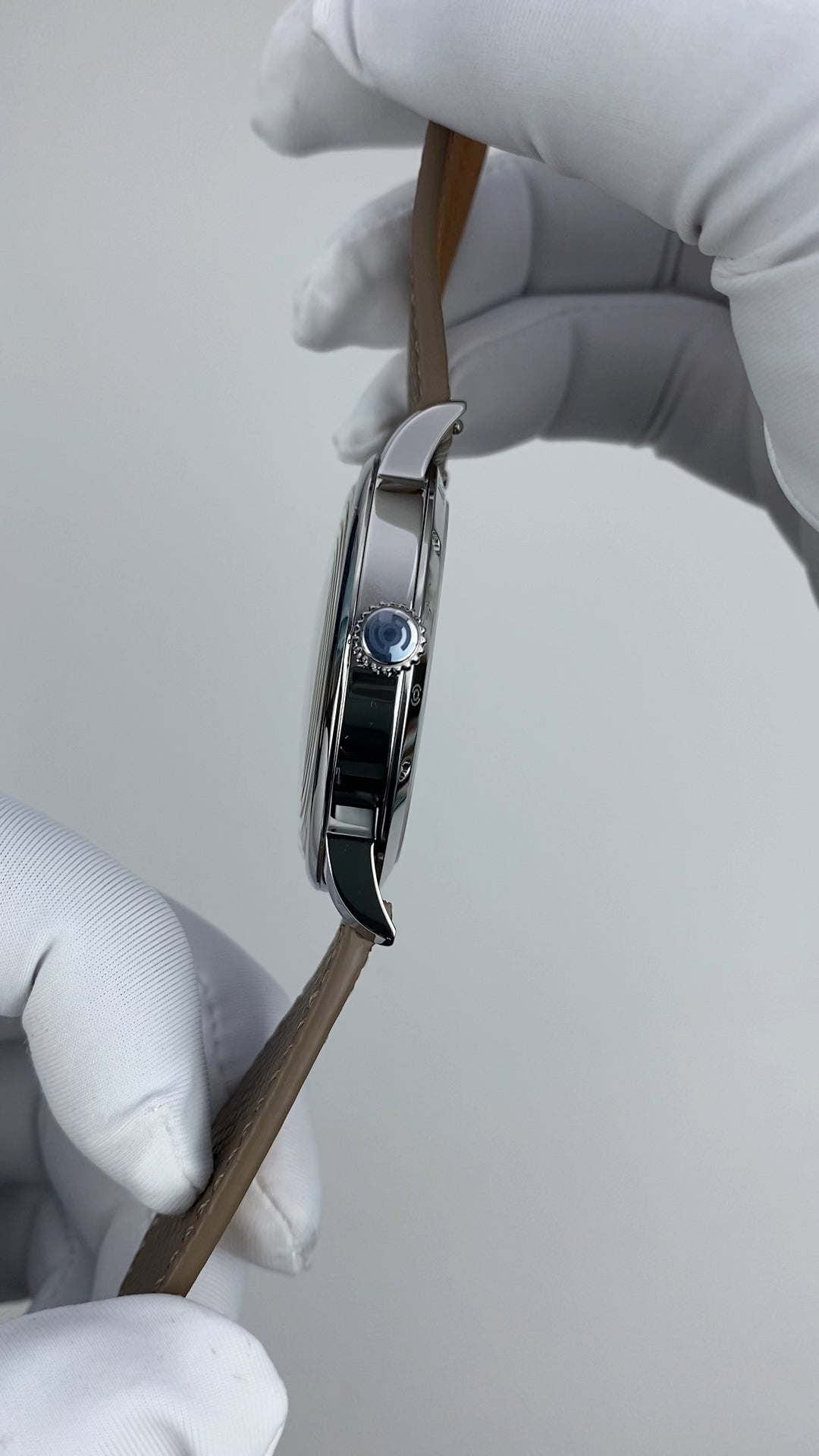 316L stainless steel. Diameter: 41 mm. Thickness: 10.4 mm. Lug width: 20.1 mm. Lug to lug: 48 mm. Water resistance: 50 meters. Weight: 79 grams (the whole watch including strap). Luminescence: Super-LumiNova luminescent material on hour and minute hands. Dial: White. Mother of pearl. Crystal: Sapphire crystal. Double domed. Has anti-reflective coating. AR coating position: Under side. Five layers of AR coating. Case back: Fixed with screws. Transparent. Sapphire crystal case back. Crown: Push-pull. Stainless steel crown. Signed with the Oriental Cherry brand logo. Crown diameter: 5.8 mm.