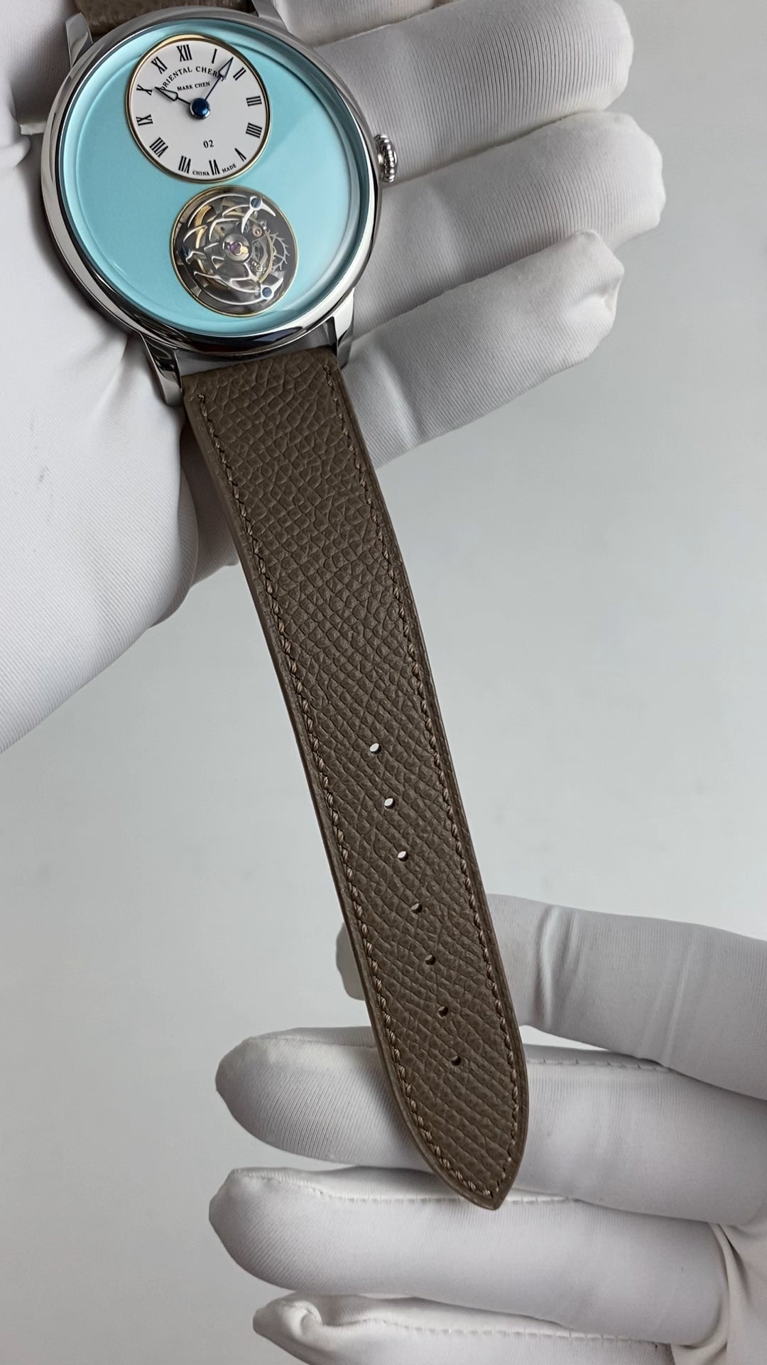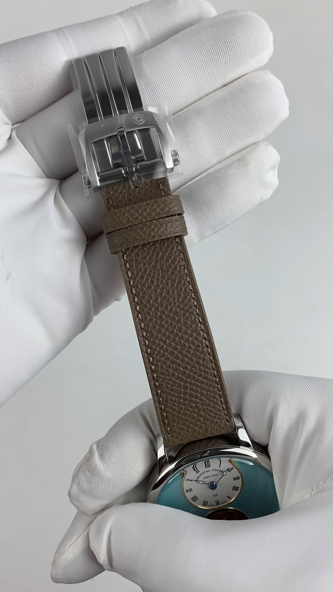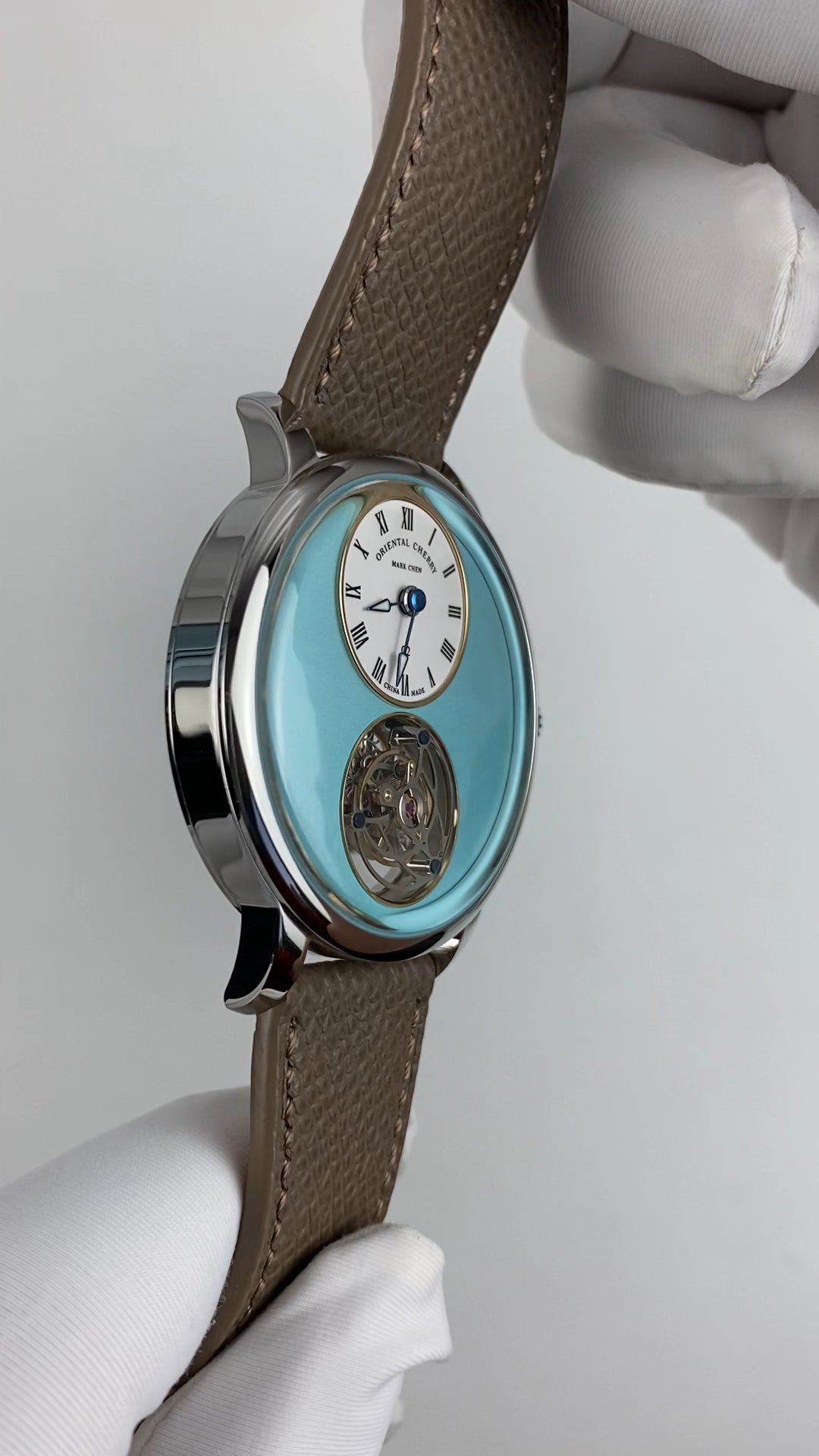 316L stainless steel. Diameter: 41.12 mm. Thickness: 11 mm. Lug width: 20.08 mm. Lug to lug: 48.11 mm. Water resistance: 50 meters. Weight: 80 grams (the whole watch including strap). Luminescence: Super-LumiNova luminescent material on hour and minute hands. Dial: Mint blue. Enamel. 搪瓷 yes, 珐琅 no. Crystal: Sapphire crystal. Double domed. Has anti-reflective coating. AR coating position: Under side. Five layers of AR coating. Case back: Fixed with screws. Transparent. Sapphire crystal case back. Crown: Push-pull. Stainless steel crown. Signed with the Oriental Cherry brand logo. Crown diameter: 5.97 mm.