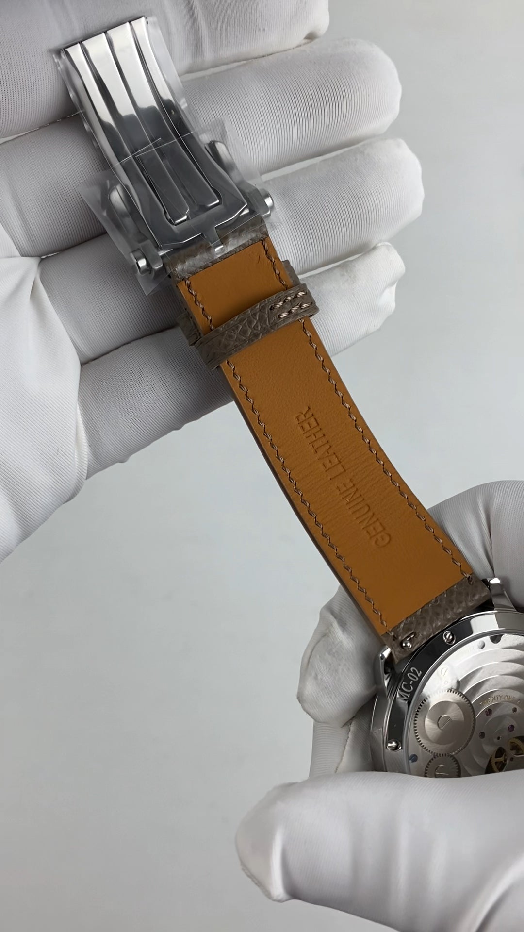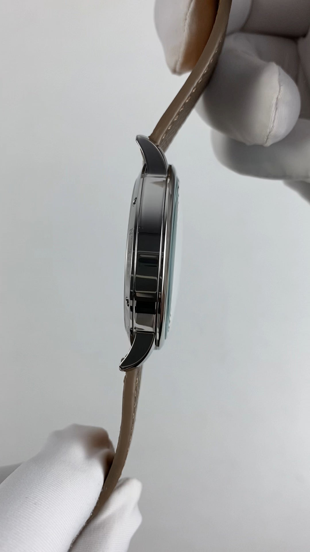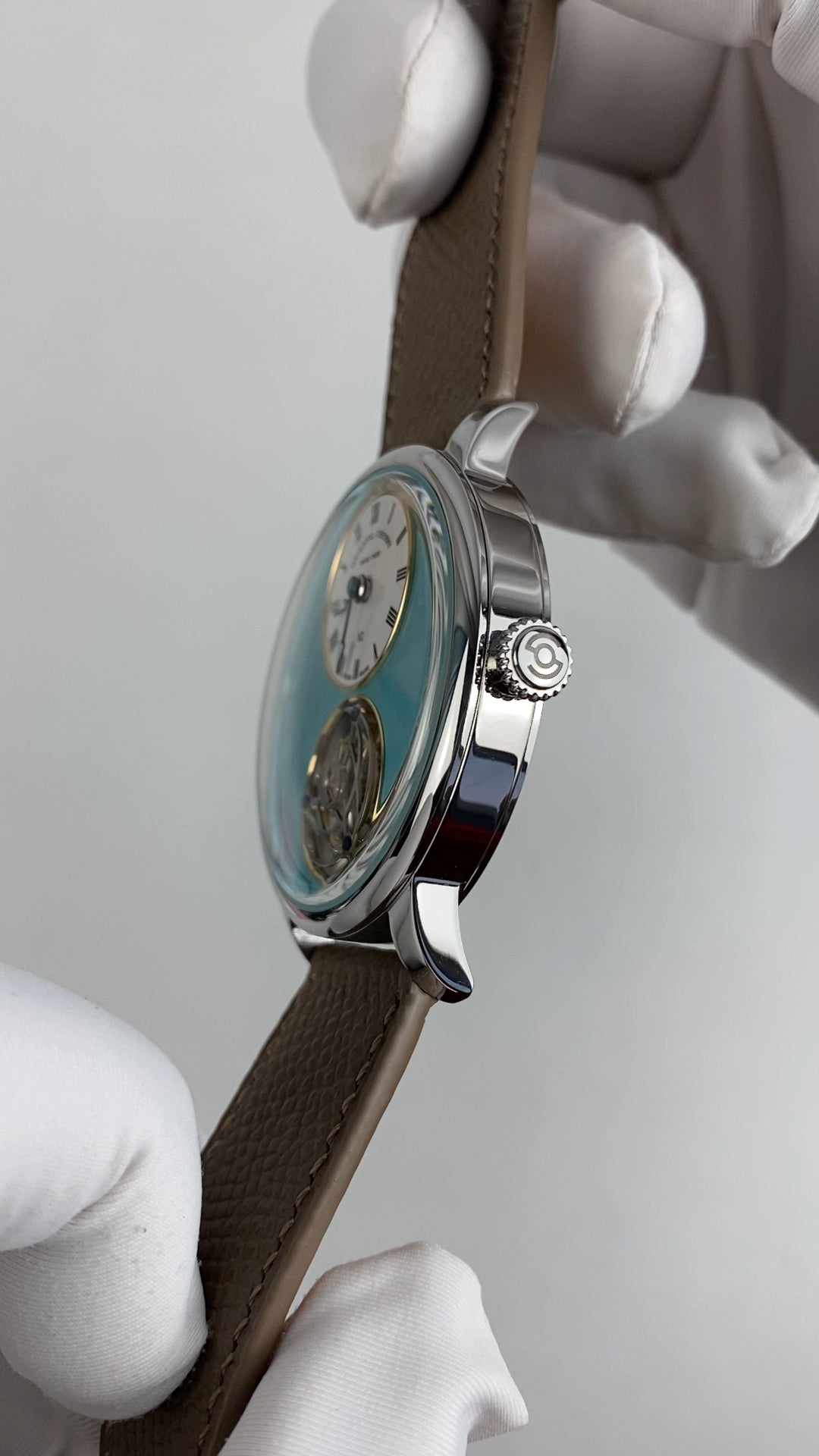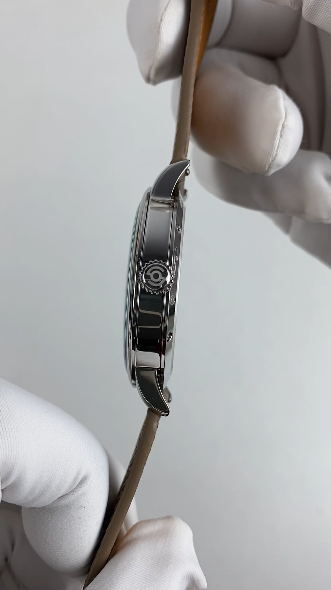316L stainless steel. Diameter: 41.12 mm. Thickness: 11 mm. Lug width: 20.08 mm. Lug to lug: 48.11 mm. Water resistance: 50 meters. Weight: 80 grams (the whole watch including strap). Luminescence: Super-LumiNova luminescent material on hour and minute hands. Dial: Mint blue. Enamel. 搪瓷 yes, 珐琅 no. Crystal: Sapphire crystal. Double domed. Has anti-reflective coating. AR coating position: Under side. Five layers of AR coating. Case back: Fixed with screws. Transparent. Sapphire crystal case back. Crown: Push-pull. Stainless steel crown. Signed with the Oriental Cherry brand logo. Crown diameter: 5.97 mm.