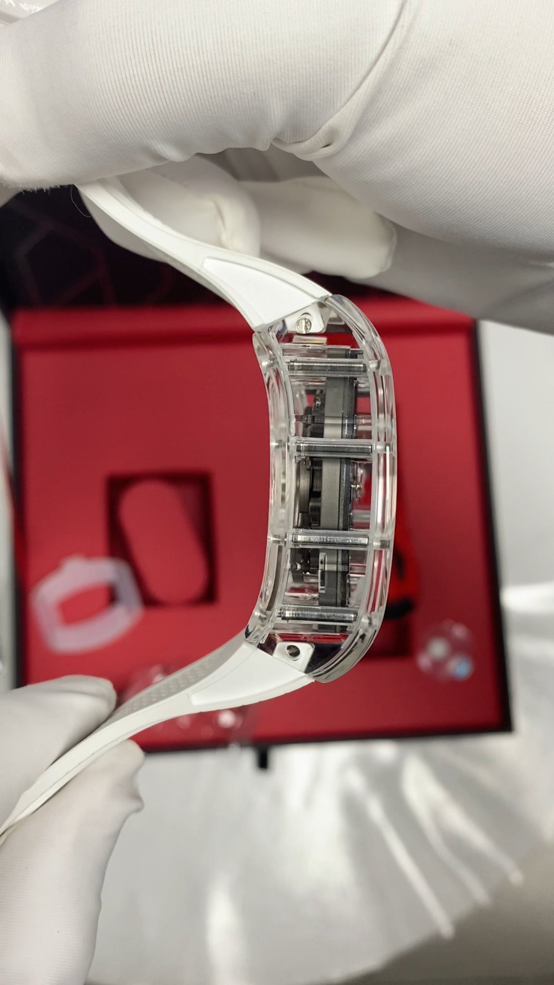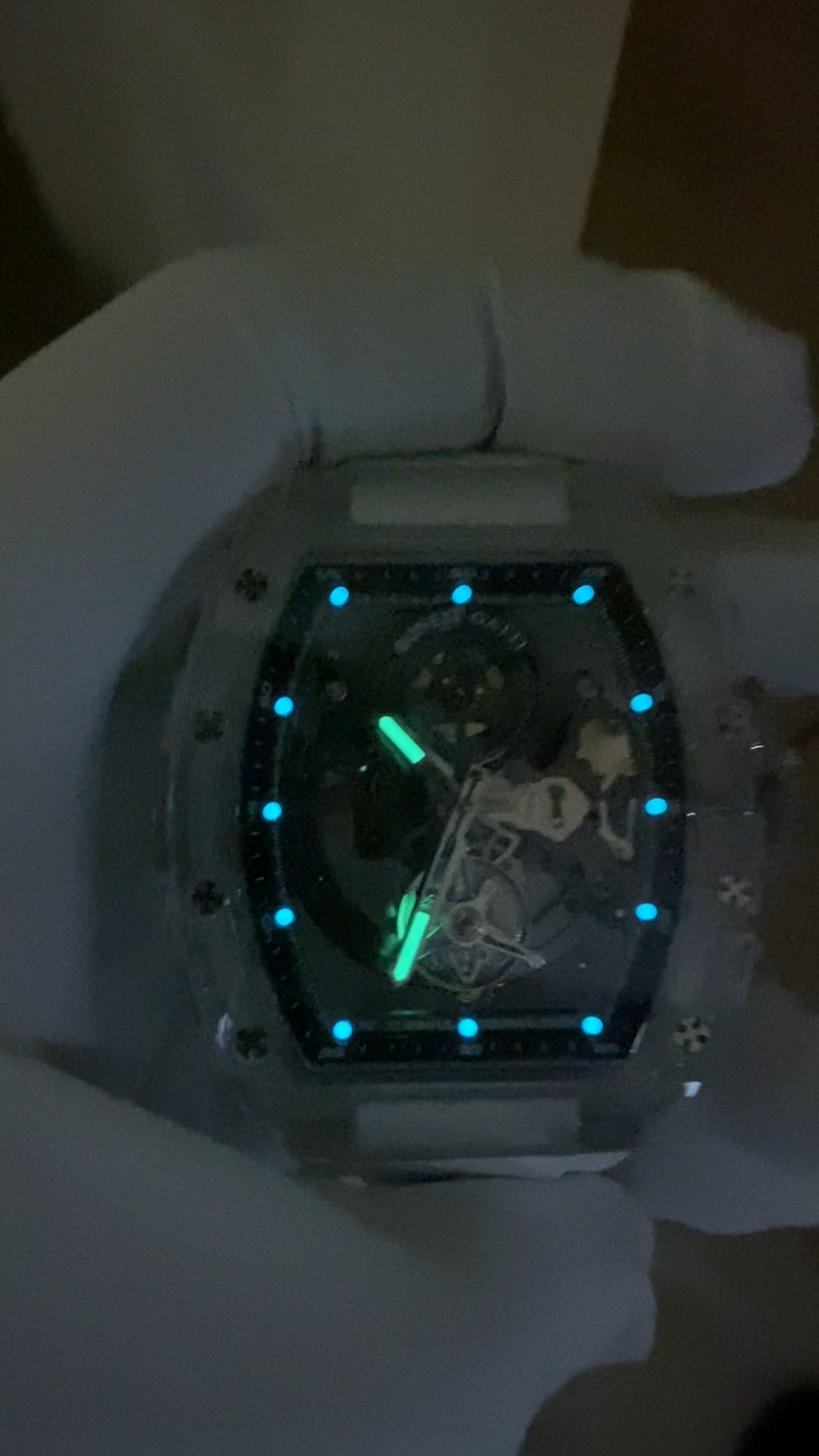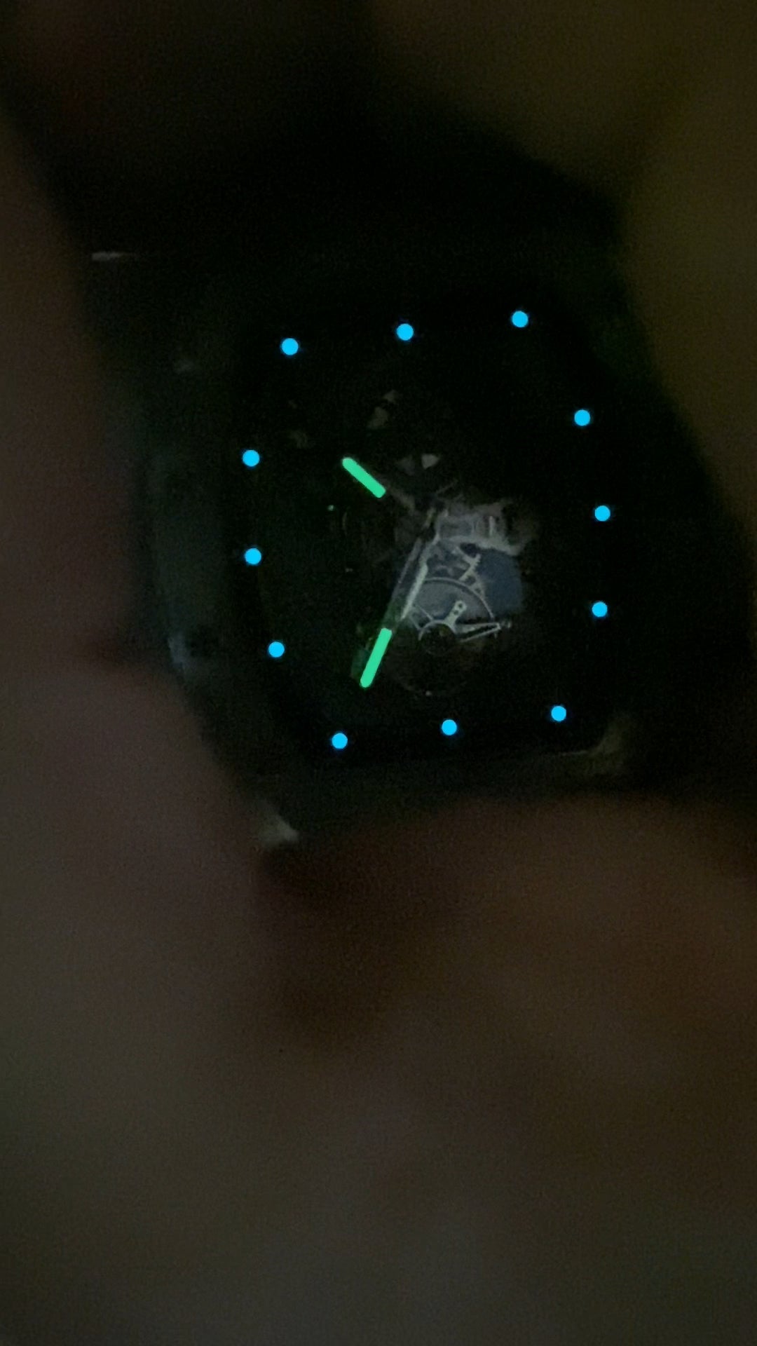 Glass. Width exclude crown: 44.8 mm. Thickness: 16 mm. Lug to lug: 42.5 mm. Water resistance: 30 meters. Weight: 94 grams (the whole watch including strap). Luminescence: Super-LumiNova luminescent material. Green luminescence on hands, and blue on hour markers. Crystal: Curved. NOT sapphire crystal. Case back: Fixed with screws. Transparent. NOT sapphire crystal. Crown: Push-pull. Gear shape. Signed with the "B" logo. Crown diameter: 9.6 mm. NOT sapphire crystal.