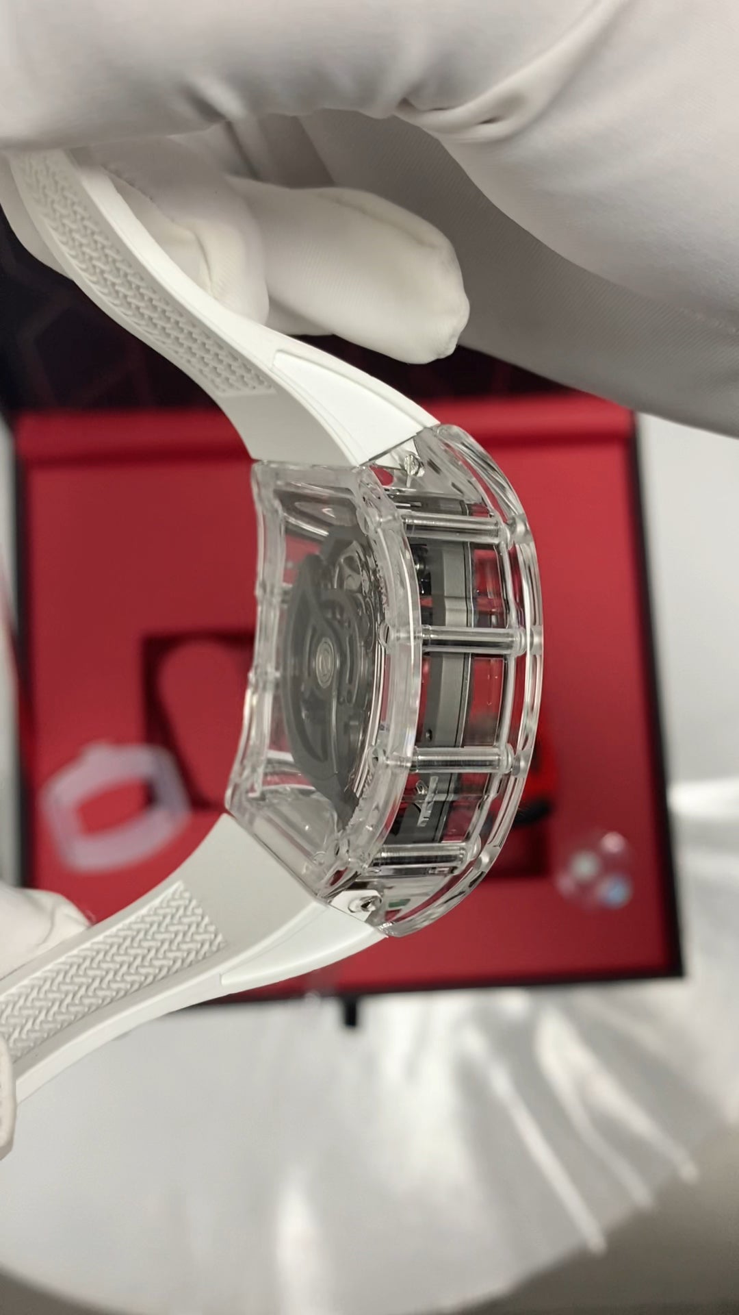 White. Fluorine rubber. No quick release: Need tool to remove strap from case. Clasp: Fold-over clasp. Stainless steel clasp. (Additional strap: Green. Fluorine rubber. No quick release: Need tool to remove strap from case.)